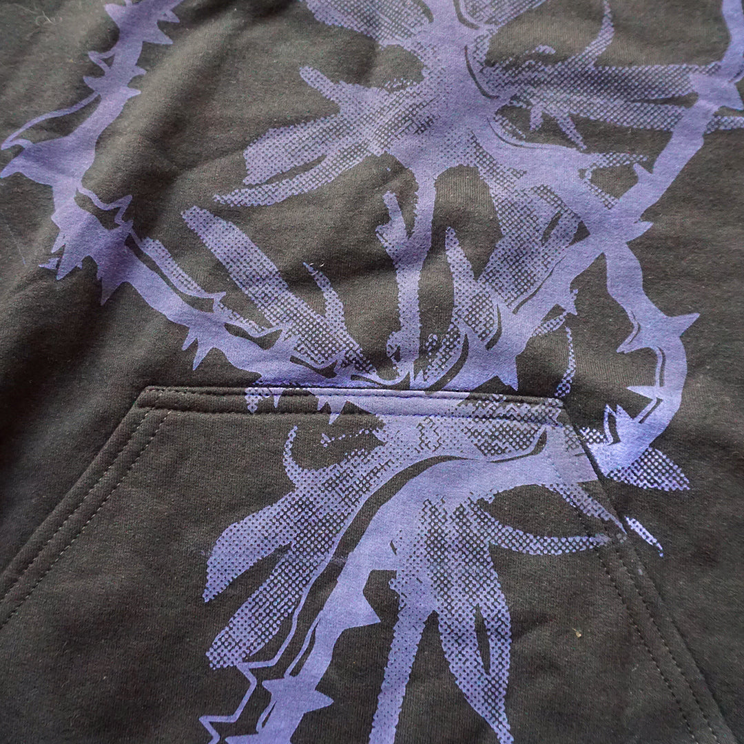 Hand screen-printed on heavy cotton black hoodies with purple or pink, water-based ink.